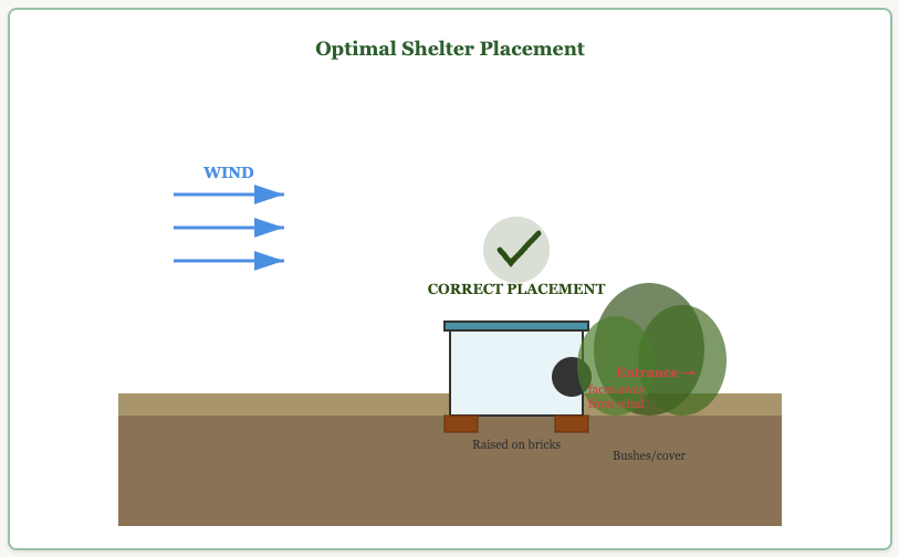 - Weatherproof: Place the shelter with the entrance facing away from prevailing winds. You can also wrap the exterior in a tarp or place it under an overhang for extra protection.